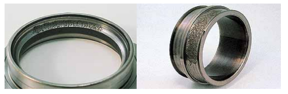 合面過盈量不足的情況下,由于滑動而使載荷點向周圍方向移動,產生套圈相對軸或外 殼向圓周方向位置偏離的現(xiàn)象。蠕變一旦產生,配合面顯著磨損,磨損粉末有可能進入 軸承內部,形成異常磨損、滾道剝落并保持架磨損及附加載荷的過程,以至可能造成保 持架斷裂。