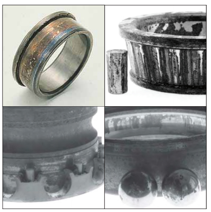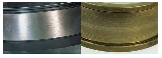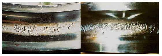 對稱位置剝落表現(xiàn)在內圈為周圍環(huán)帶剝落,而外圈呈周向對稱位置剝落(即橢圓的短 軸方向),其產生原因主要是因為軸承箱孔橢圓過大。當軸承壓入橢圓偏大的軸承箱孔中 時,使軸承外圈產生橢圓,在短軸方向的游隙明顯減少甚至負游隙。軸承在載荷的作用 下,內圈旋轉產生周向剝落痕跡,外圈只在短軸方向的對稱位置產生剝落痕跡,這是該 軸承早期試銷的主要原因。采取的對策是提高軸承箱孔加工精度。